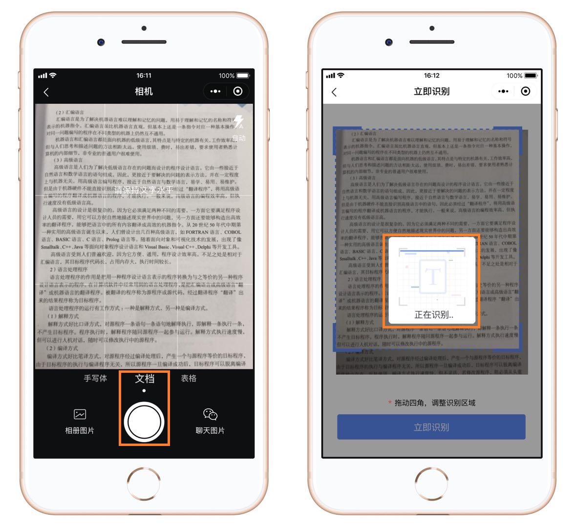 切换到【文档】识别功能,找来一份纸质文档,将它拍下后,接着点击底部的【立即识别】,等待识别结果。