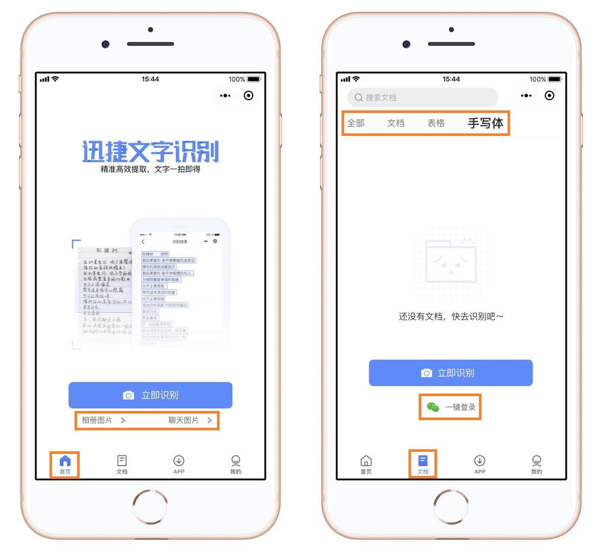 进入工具【首页】可以看到,支持拍照识别、相册图片识别、聊天图片识别 ;点击【文档】按钮,这里会有识别记录,使用微信一键登录还可以同步文档。