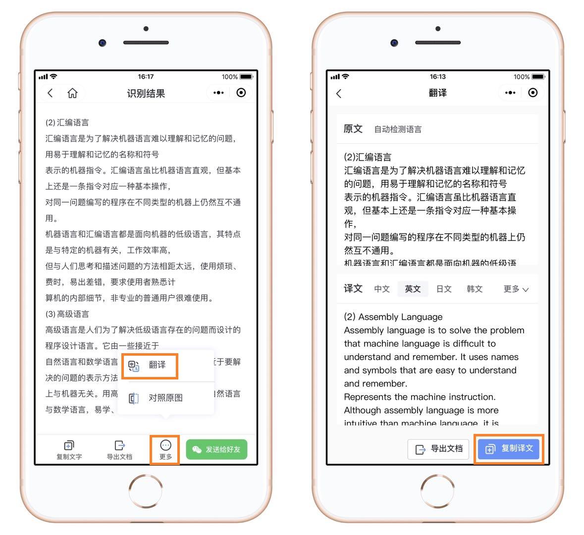 识别结果还是非常准确的,并且帮我们自动排版,除了复制和导出文档,点击【更多】还能翻译 ,支持十几种语言。