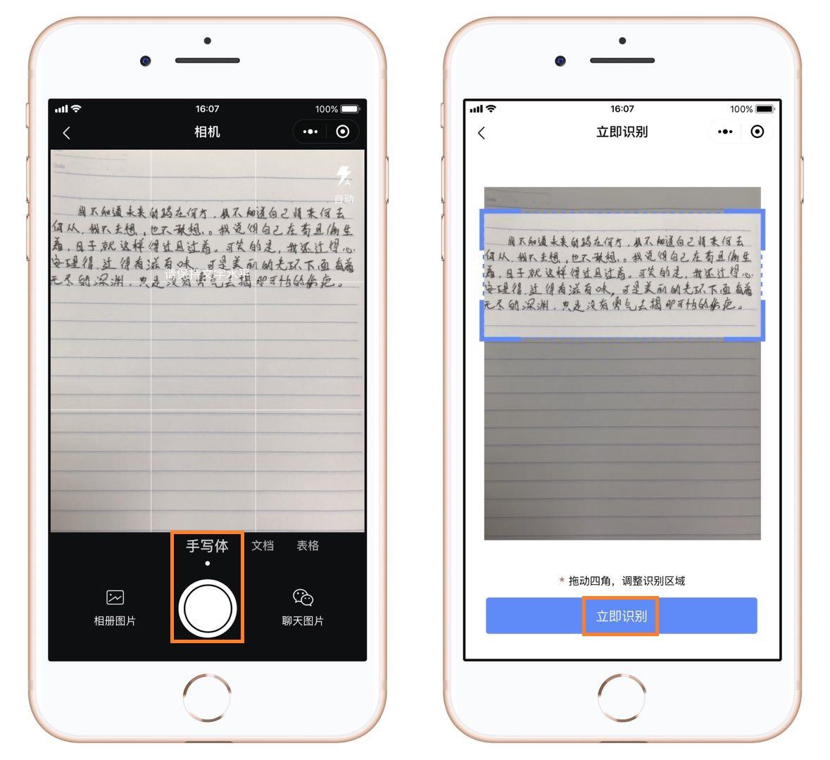 首先选择【手写体】,将镜头对准手写的文本,按下快门键拍下后,调整识别区域,然后点击【立即识别】按钮。