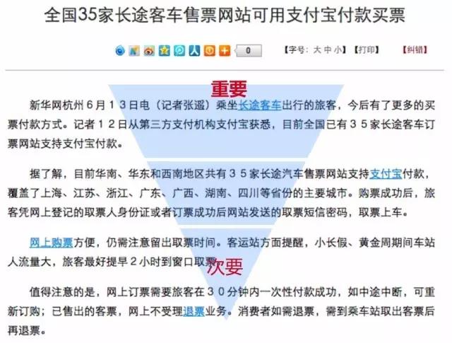 如上图,是传统写作方式的内容组织形式,估计有很多人会阅读一点开始的内容,但很少有人会从头读到尾,而吸引眼球的内容组织方式,是先抛结论,这才是用户想要看的信息,大多数人只需要一个结论。