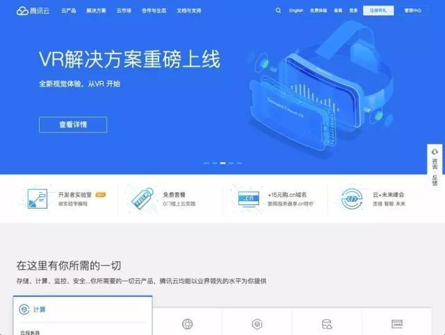 腾讯云官网首页首屏内容,首屏下方,部分内容可见,暗示用户还有更多内容。
