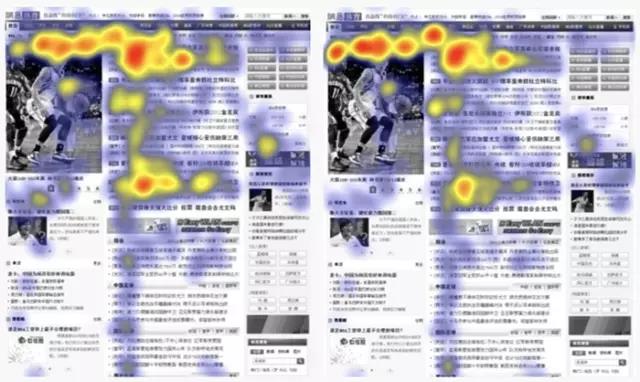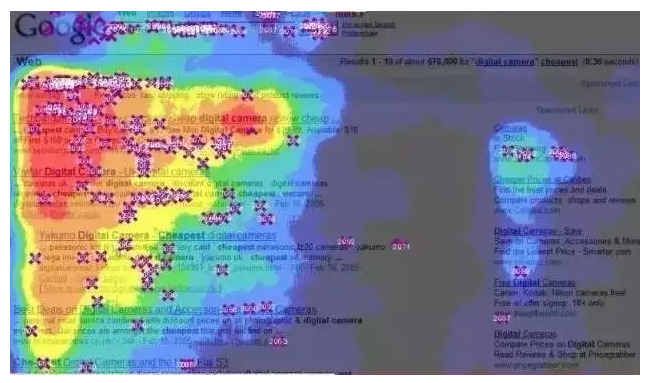 此热力图显示了一个典型的浏览方式,先阅读前几行,然后沿垂直方向向下浏览,当遇到感兴趣的内容,会多阅读一些,整体形状看起来,像一个“F”形。