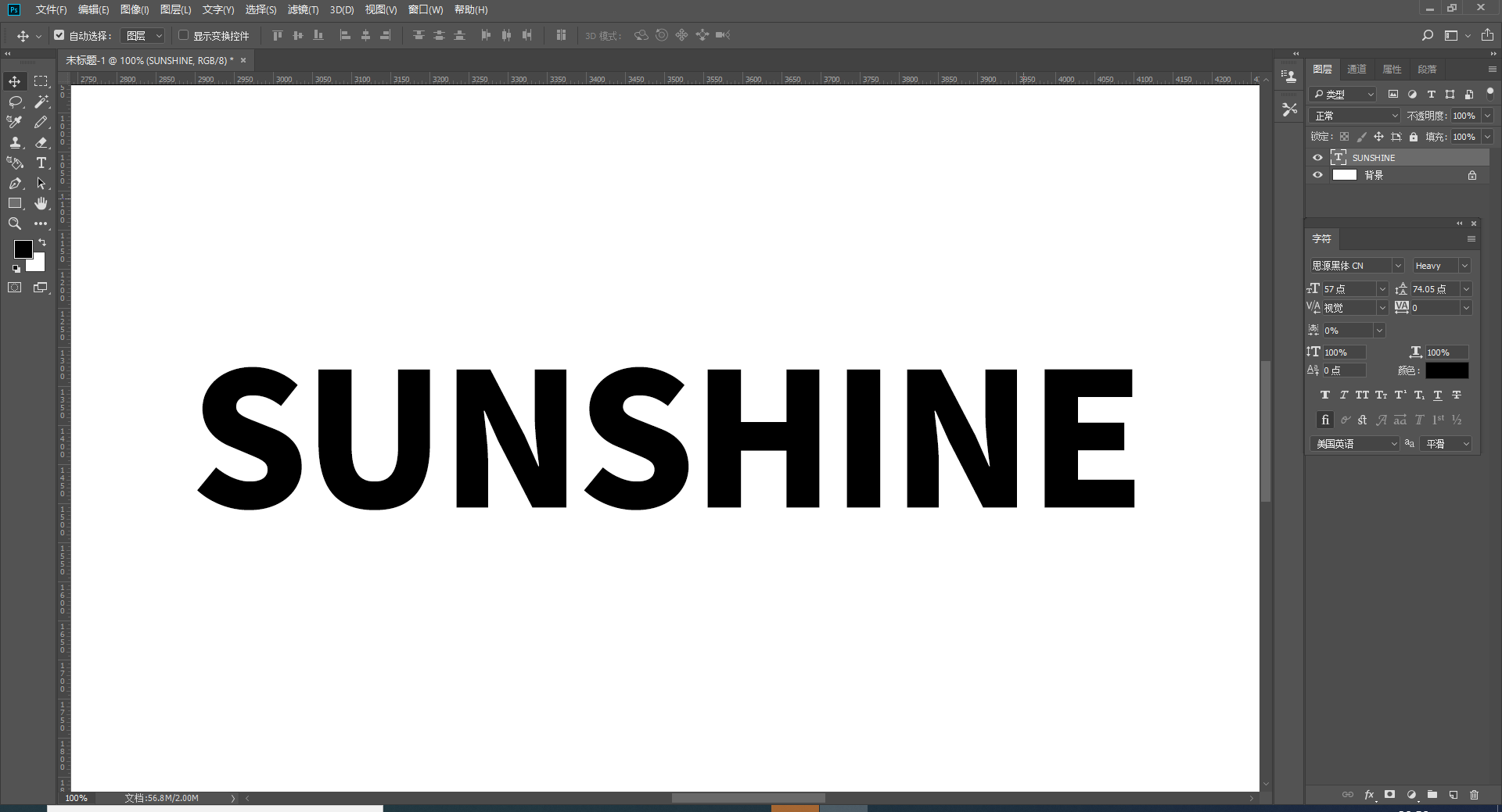 首先,我们在PS里新建一个画布,输入文字。这里的字体我们就选择思源黑体。