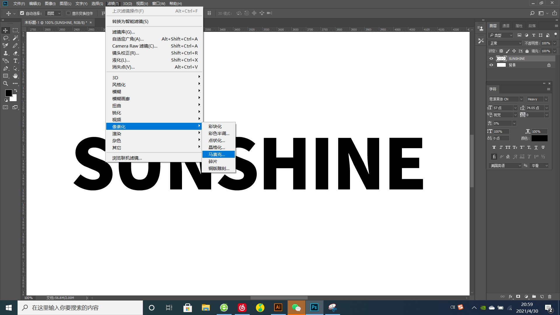 我们将文字图层栅格化,然后选择“滤镜”-“像素化”-“马赛克” 。