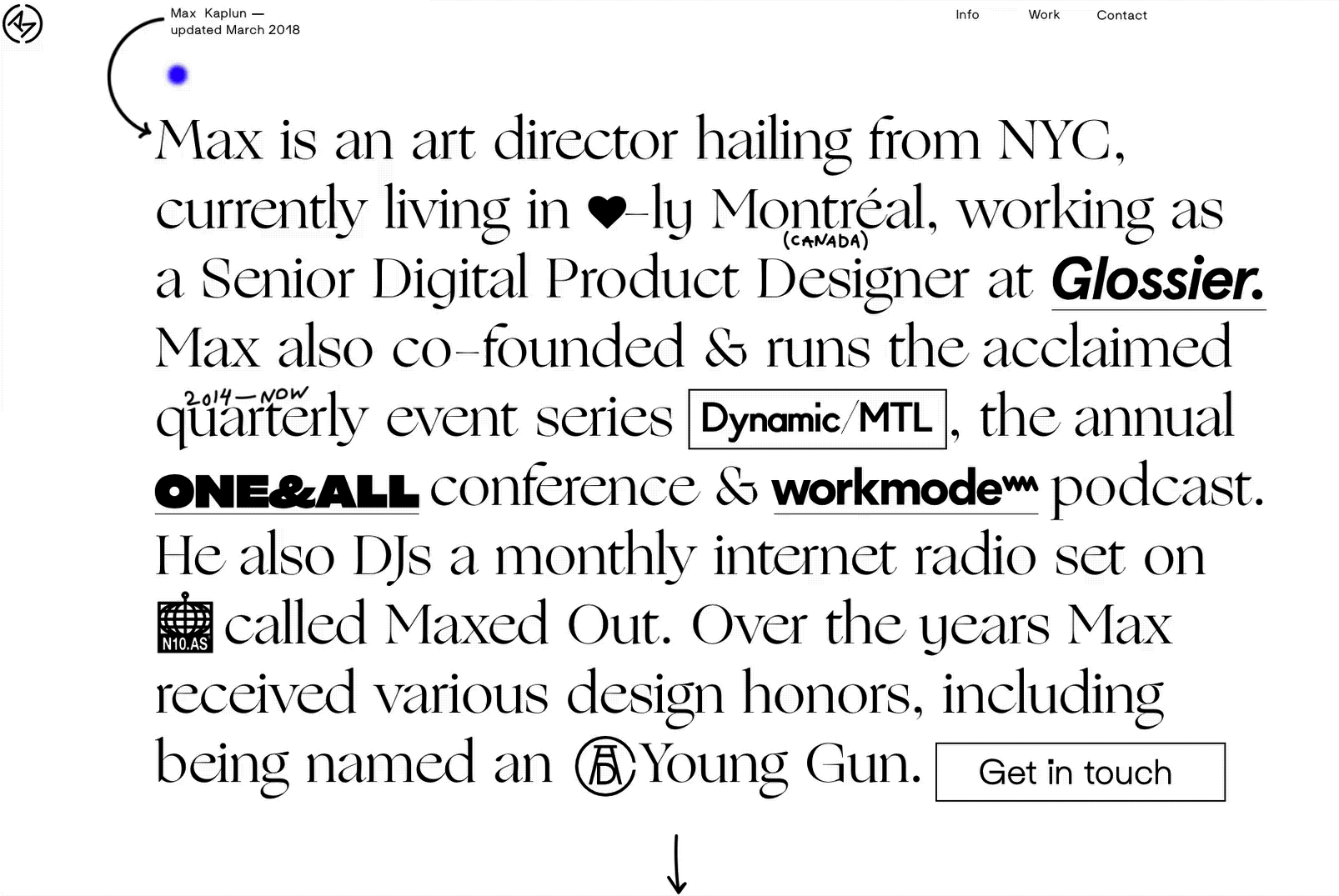 Max Kaplun的作品集网站中,同样是使用纯文本来构建视觉,不过他借助最简单的字符、字重和色彩变化来装饰。