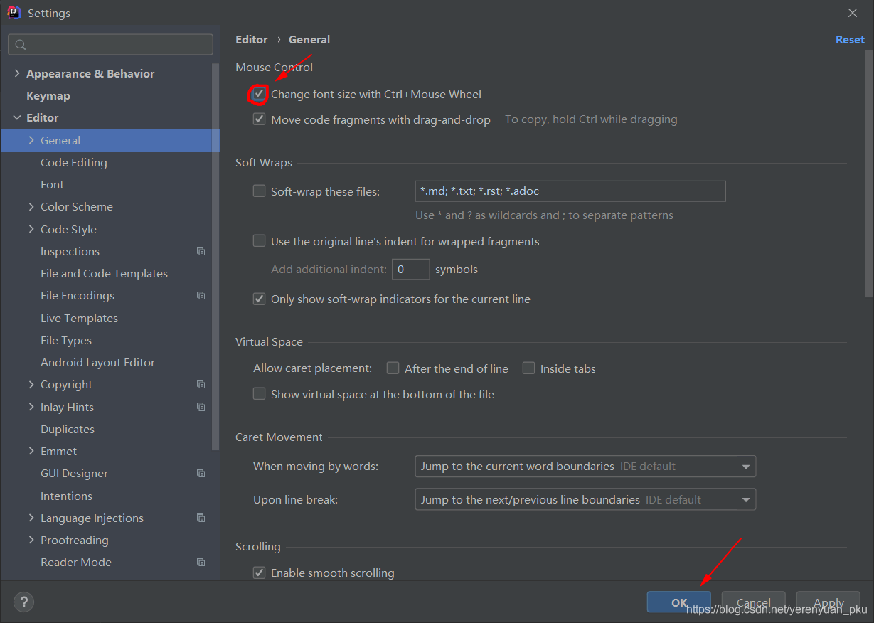 接着,勾选Change font size with Ctrl+Mouse Wheel前面的框框,并点击OK按钮,如下图所示。