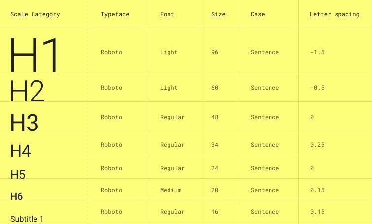 Material Design Type Scale 包含 13 种字体样式,用以辅助产品及内容的不同需求。