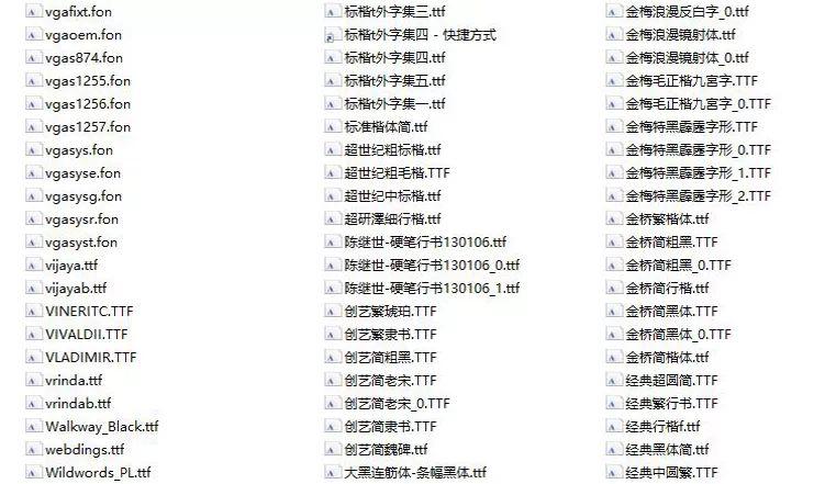 共计有1211款,就是这些年来我自己下载的一些乱七八糟的字体,什么都有,能不能商用也未知,里面也不少是英文字体,我自己平时很少用到。(下图只展示了较少的一部份)
