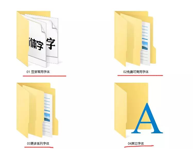 先给大家看看我给大家整理的字体包吧,主要由这几个部份组成——豆芽常用字体/免费可商用字体/更多系列字体/其它字体/截图给大家简要展示一下,后面会具体聊到各自的区别。
