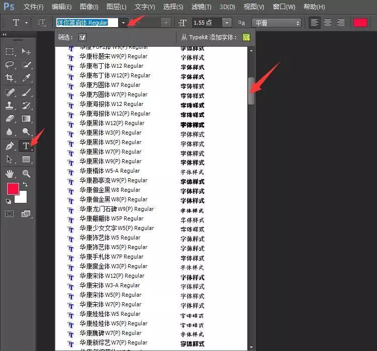 字体安装好了之后,在PS中显示的状态,重启PS就好了,这时就可以看到PS中可选择的字体变多了,做图片时就可以随意选择自己喜欢的字体啦。