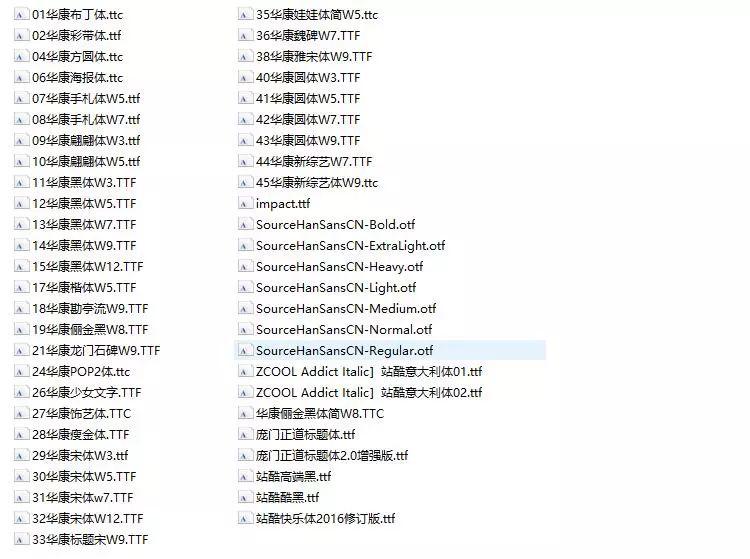 01.豆芽常用字体,共51款,其中华康系列是继前2年方正侵权事件后淘宝官方推荐我们电商设计中用的字体,既然马云都推荐了,大家平时做图就可以放心大胆地用了。(注:其它地方能不能商用目前不太清楚,目前仅知道淘宝可以用)
