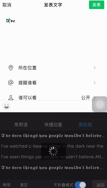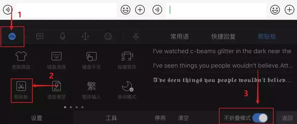 搜狗输入法跟这个同理,不过不需要打开「 不折叠模式 」,直接通过剪切板粘贴就有防折叠的效果了。