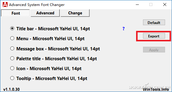 来,进入正题,电脑爱好者公众号界面输入“字体”获取“Advanced System Font Changer”下载地址。想改系统各个位置的字体、字号,一步到位。友情重要提醒:在运行软件后,一定一定先点击右侧的“Export”将目前的系统字体设置导出,这样恢复起来方便些,不然觉得那些修改不合适只能一步一步改回来的说。