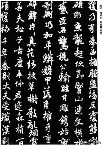 《云麾将军李秀碑》,即《云麾将军碑》,是李书碑中的代表作,天宝元年(公元742年)立于幽州。碑原在直隶良乡县,被裂作基础,明万历六年(公元1578年)李荫等于县署中掘得六石,县令王惟俭携四石于大梁,遂佚。余二石在北京,各存十二行,每行五至十三字不等。翻刻本甚多。字迹漫漶,有宋拓全本。此碑书法颇得明清人赞赏,认为书法超过李书他碑。翁方纲《苏斋题跋》认为,“北海至此碑,则松高巨石,拔地倚天,而精神疑固,炯明万古。后来赵、董不过各得其一节耳。”顾观、李宗潮都认为《李思训碑》、《麓山寺碑》诸碑都在其下。顾观说:“其痛快中有含蓄浑融之妙也。”李宗潮说: “谛玩其笔法,倜傥沉雄,全从羲、献得神,开后来赵、董支派”(图63,局部)。此碑结体、用笔外拓,线条纤劲飞动,豪放中有雅致,强劲中有沉稳。