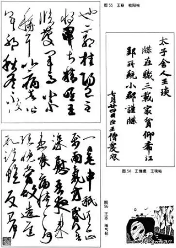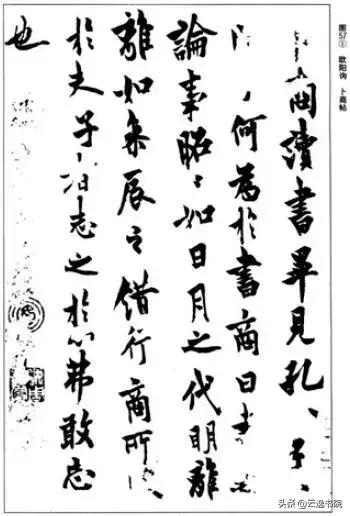 《卜商帖》、《张翰帖》,纸本,疑为摹本。宋代米芾曾在《书史》中记载说,欧阳询写有历史故事十余帖,《卜商》、《张翰》可能是其中的两帖。《戏鸿堂帖》还刻有其它五帖。《卜商帖》(又称《卜商读书帖》)六行五十三字,《张翰帖》(又称《张翰思鲈帖》)十行九十八字(图57①、②)。