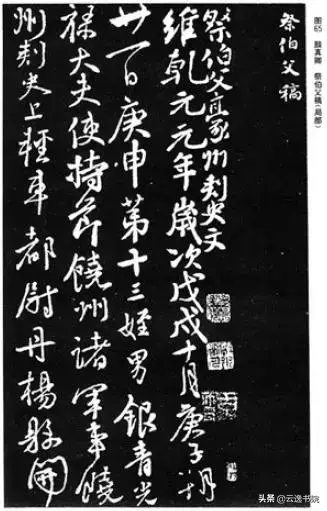 《祭伯父文稿》,亦称《祭伯父稿》,唐乾元元年十月书,原有墨迹本,曾由明代李日华、清代高士奇收藏,后不知去向。《忠义堂》、《甲秀堂帖》、《穰梨馆》皆有刻本,二十八行,除涂改后为三百八十九字(图65,局部)。