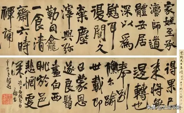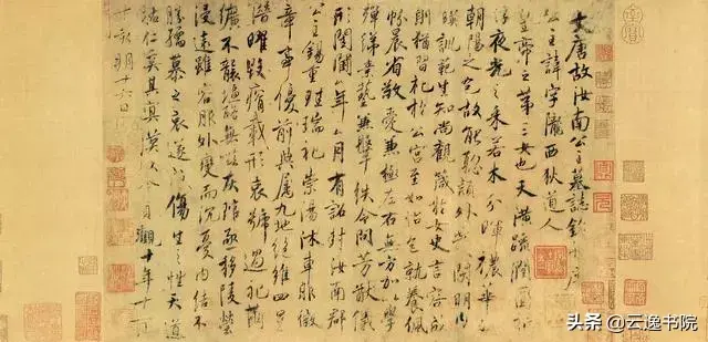 此稿书法,结体严谨,用笔从容,线条雄劲锋利,墨色华润,极少枯笔,说明作者写此稿时情绪稳定,不似写《祭侄文稿》时那样心情激动,线条飞舞。故明代陈敬宗说,此稿书法“字字皆有规矩,不失常态”。