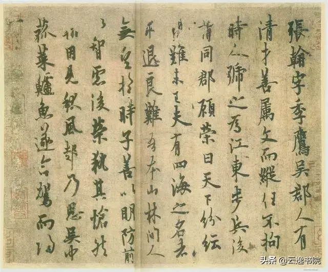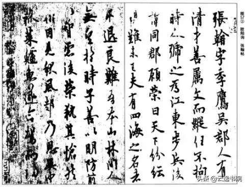 张瀚,字季鹰,吴郡人。有清才,善属文,而纵任不拘,时人号之为江东步兵。后谓同郡顾荣曰:“天下纷纭,祸难未已,夫有四海之名者,求退良难。吾本山林间人,无望于时,子善以明防前,以智虑后。”荣执其怆然。翰因见秋风起,乃思吴中菰菜鲈鱼,遂命驾而归。《卜商帖》、《张翰帖》书法与欧阳询的楷书险峻是一致的。结体都处纵势,向右欹侧,结构险劲严谨,接近楷体,少于萦带,简笔处也都以楷行点画处理。入笔方劲,收笔时偶有停顿,转折方硬,极少圆转,重按轻提,很少藏锋,处处方笔露锋,间空多于字距,险奇胜其楷书。《张翰帖》稍有不同,结体虽然险劲,但不是字字严谨,连笔较多,偶有萦带,方中带圆,入笔处露锋重,重笔时笔画厚重,轻笔时线条遒劲。轻重变化明显,欧书特色鲜明。乾隆弘历评其行书云:“妙于取势,绰有余妍”。明代项穆评论说:“欧阳信本亦拟右军,易方为长,险劲瘦硬,崛起削成。若观行草,复太猛峭矣!”