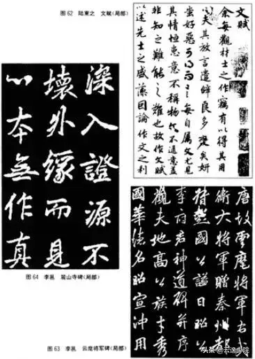 《麓山寺碑》,又名《岳麓寺碑》,碑已毁,在湖南岳麓书院。开元十八年(公元730年)九月十一日立,李邕文并书,江夏黄仙鹤刻。苏州博物馆藏有宋拓本。王文治认为,北海之书“惟《岳麓》、《云麾》最为烜嵘,如泰山卓立,觉训象巍然,宛在目前也”。《岳麓》书法比《云麾》沉稳内敛,结体平整而势欹侧,笔画凝重而气势雄强。何绍基说:“《云麾》颇嫌多轻捝处,惟此碑沉着劲粟,不以跌宕掩其朴气,最为可贵”(图64,局部)。此碑比《云麾》书法凝重内敛,线条较比厚重,运笔速度也较慢,很少有飞动的线条,连笔也比《云麾》少。临写时要注意这些特点。