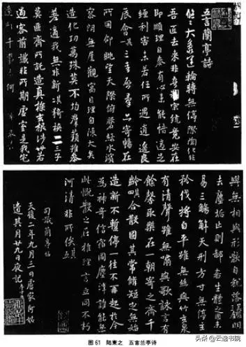 《五言兰亭诗》,传世有墨迹本和刻帖两种,刻本有宋游似本,帖后有该氏题记云:“右唐司议郎陆柬之所书兰亭诗,高宗皇帝尝俯临之,似偶得真迹既刻之石,遂以附禊帖之后”。即所谓《兰亭八柱》之一。刻石在北京市中山公园内(图61)。