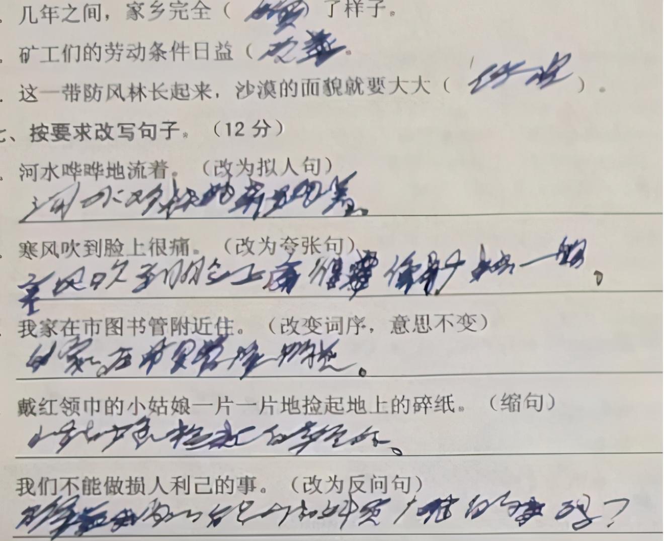首先我们来看这位孩子的语文试卷,看到这篇作文的第一反应,首先就是:“这写的什么玩意?”