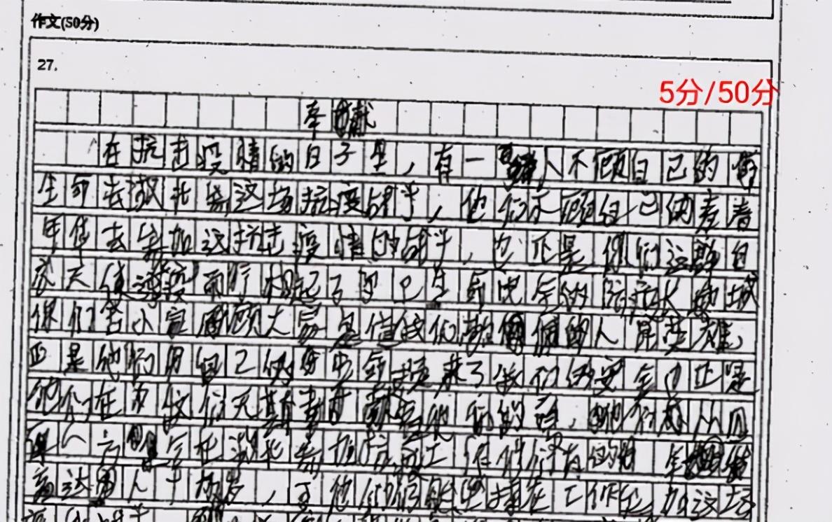 在作文末尾,老师给的鲜红的五分也是十分扎眼,五十分的作文因为字迹不清拿五分,网友朋友都替孩子无奈。