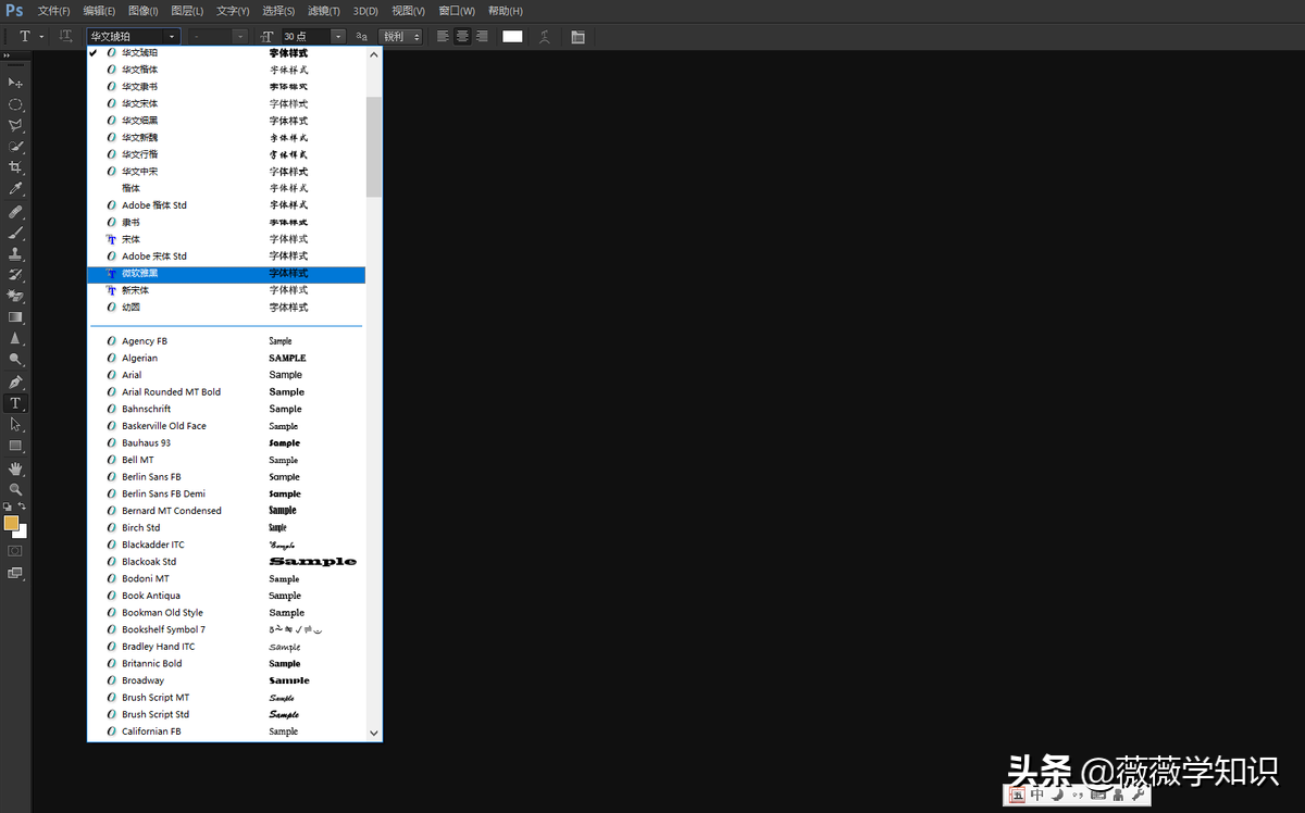 首先,我们看看什么是字体,打开PS软件,我们点击文件工具,在属性栏里面显示着不同的字体,这是电脑本身佩带的。