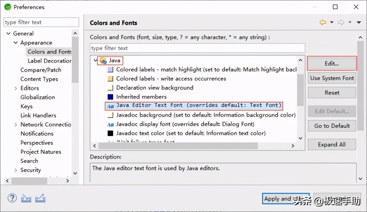 工具:eclipse方法/步骤:点开window--preferencesGerneral——Appearance——ColorsandFonts,找到TextFont,双击打开根据需...