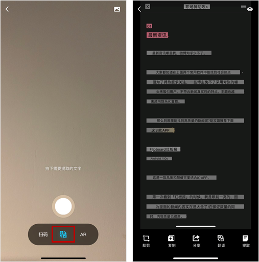 识别后的结果,我们可以复制到粘贴板、翻译,或者发送到别的 APP 上,还可以导出为 docx 和 txt 文档呦~