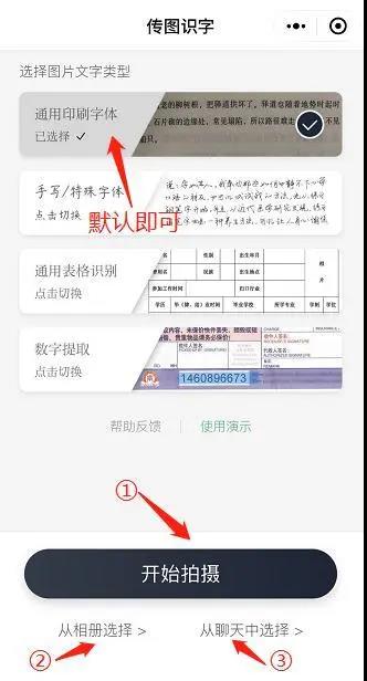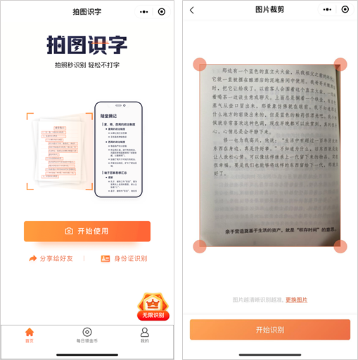 在微信小程序中搜索【拍图识字】,进入界面后点击「开始使用」。然后选择「拍照」或从「手机相册」选取要识别的图片,在「图片裁剪」页点击「开始识别」,就会出现识别结果。