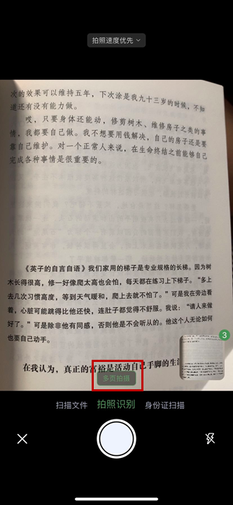 点击「相机」,在「拍照识别」页面注意打开「多页拍摄」,然后按快门连续拍照片即可。拍完后,点击右上方带有数字的微型相册。
