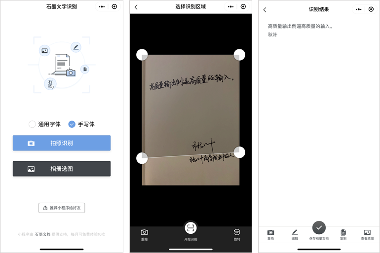 本来以为能识别印刷体文字就已经很厉害了,谁想到「石墨文字识别」小程序能直接识别手写字。整理会议记录、学习笔记,方便多啦!