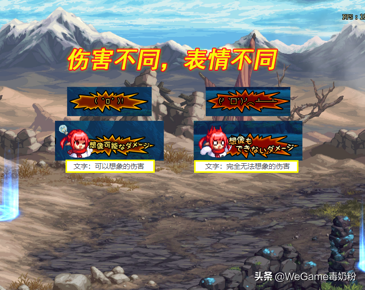 日服22年的愚人节“伤害字体”更加拉风!可以根据伤害的结算方式不同,展示出不同的角色表情特效 ,比如下图所示,文字是翻译。左边是普通999伤害的特效,魔界人就会“叮”的一声冒出来:可以想象的伤害,而右边是暴击情况下的999伤害特效,魔界人极为惊讶:这是完全无法想象的伤害。