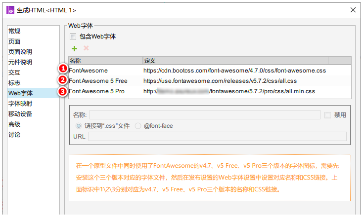 例如我们在一个原型文件中同时使用了FontAwesome的v4.7、v5 Free、v5 Pro三个版本的字体图标,需要先安装这个三个版本对应的字体文件,然后在发布设置的Web字体设置中设置对应名称和CSS链接,v4.7设置名称为【FontAwesome】, v5 Free设置名称为【FontAwesome 5 Fee】,v5 Pro设置名称为【FontAwesome 5 Pro】,对应的CSS链接以对应专题页面或提供的CSS链接为准。