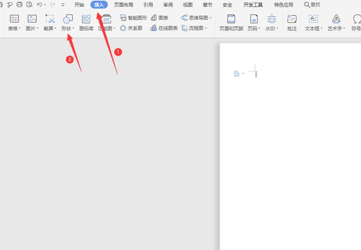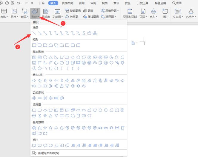 第二步:在新建的空白文档中点击菜单栏里面的“插入”,进而在下面工具栏找到“形状”选项: