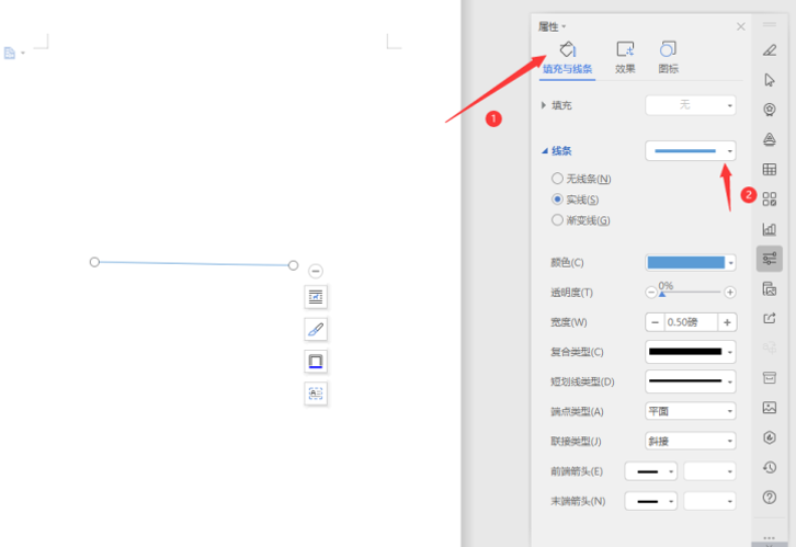 第六步:在“属性”设置框里面选择“填充与线条”,然后在下面的“线条”项目中点选旁边倒黑三角形,在下拉菜单中选择虚线即可:
