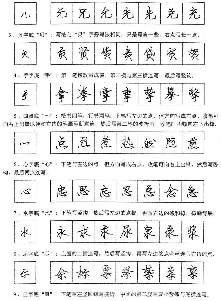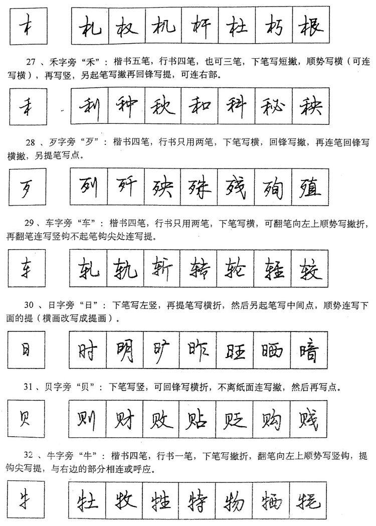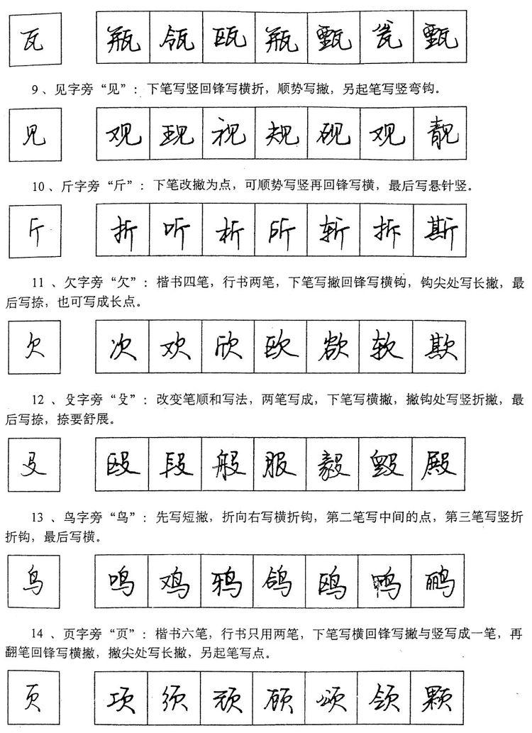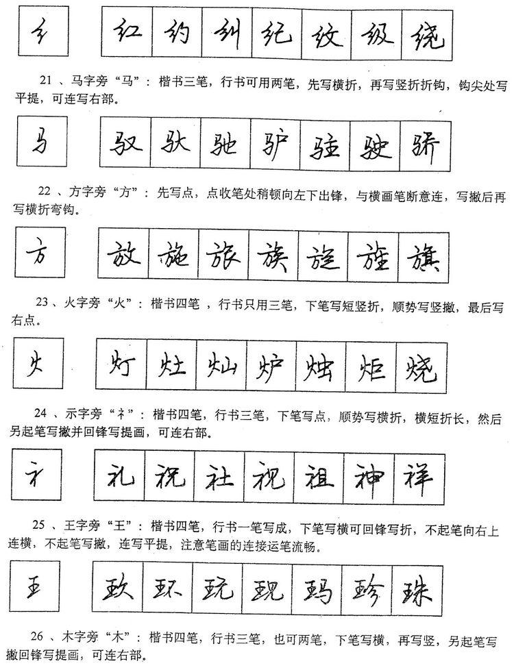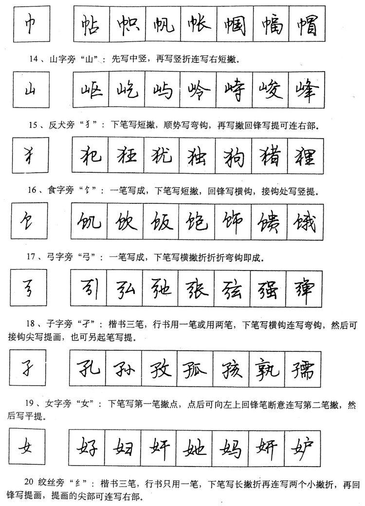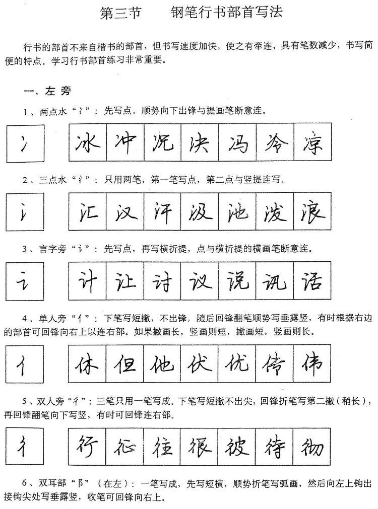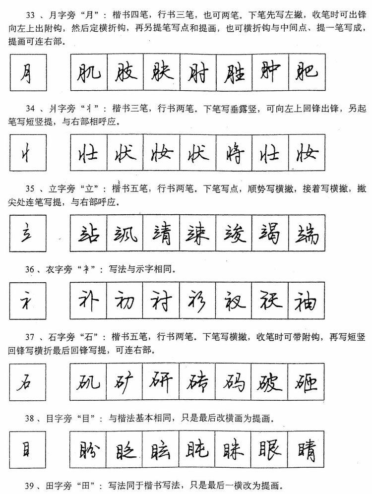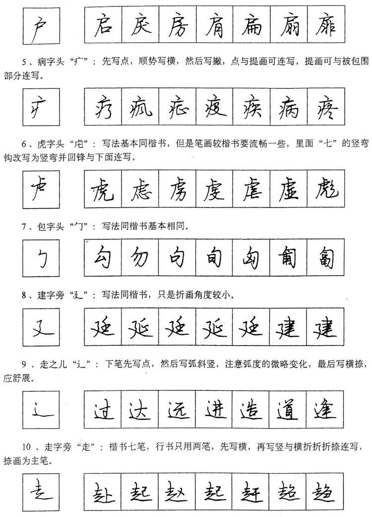 (四)学习行书宜从部首开始。 行书在长期使用过程中形成了一些约定俗成的写法,熟悉和掌握这些部首的写法,就能了解行书的造形规律,收到举一反三之效。