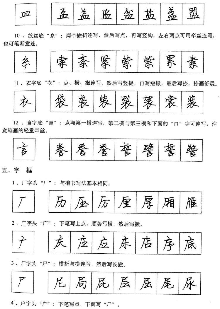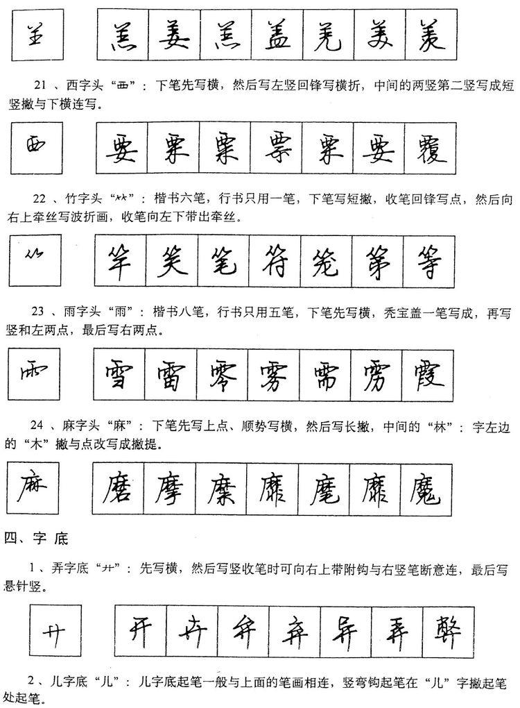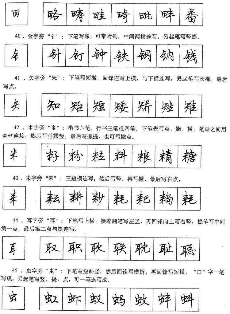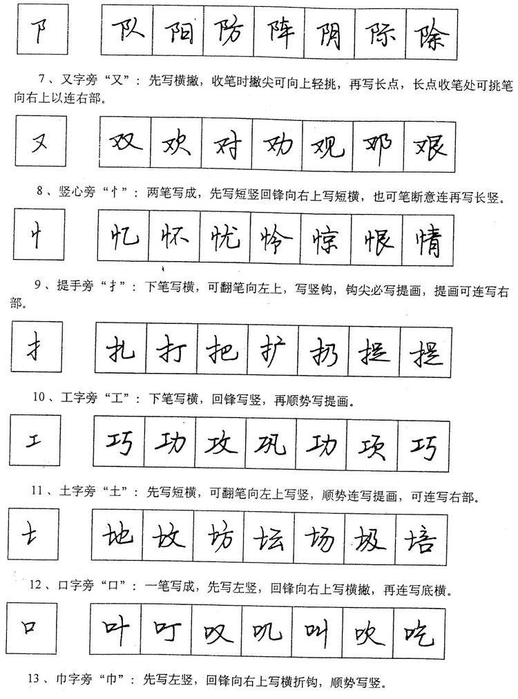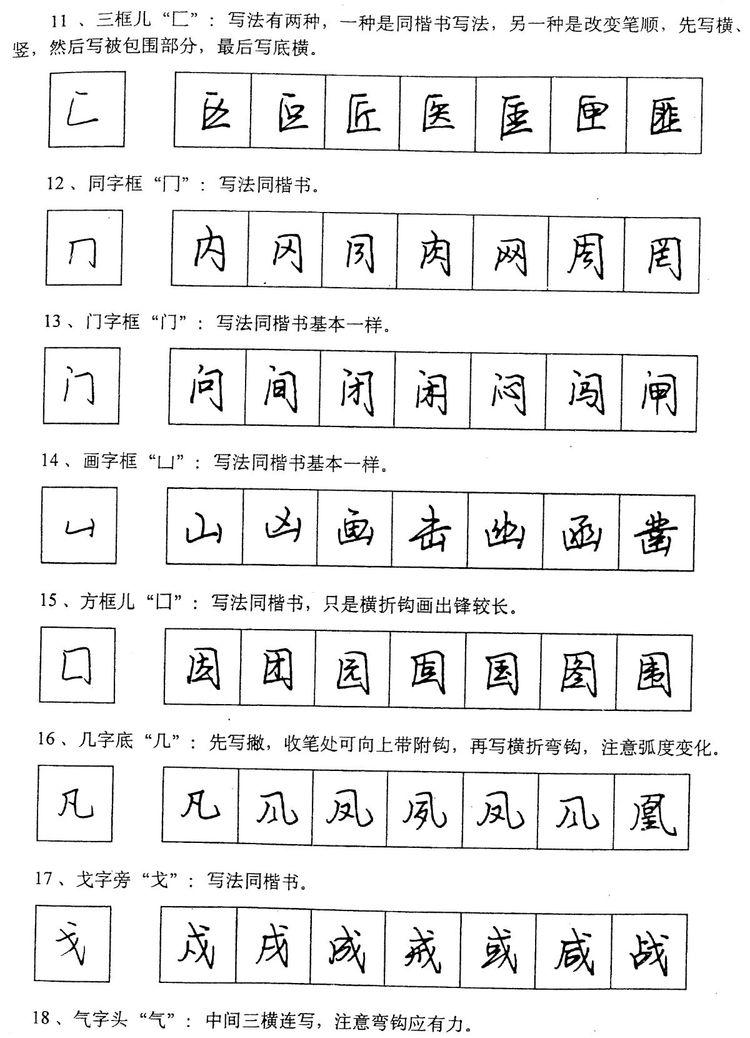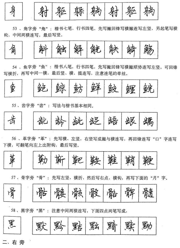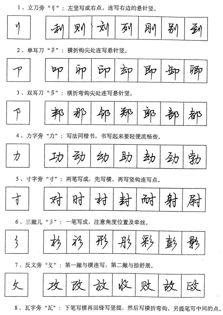 (四)学习行书宜从部首开始。 行书在长期使用过程中形成了一些约定俗成的写法,熟悉和掌握这些部首的写法,就能了解行书的造形规律,收到举一反三之效。