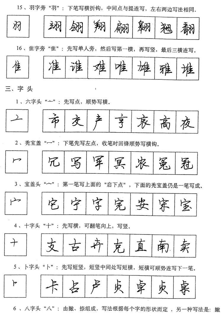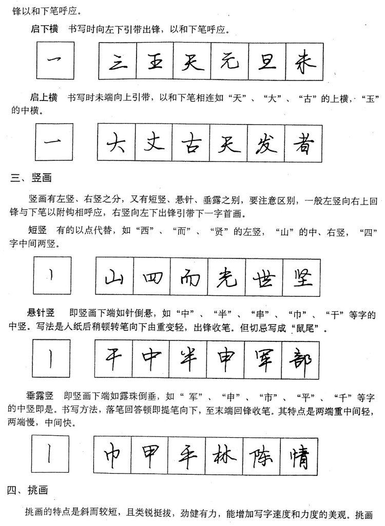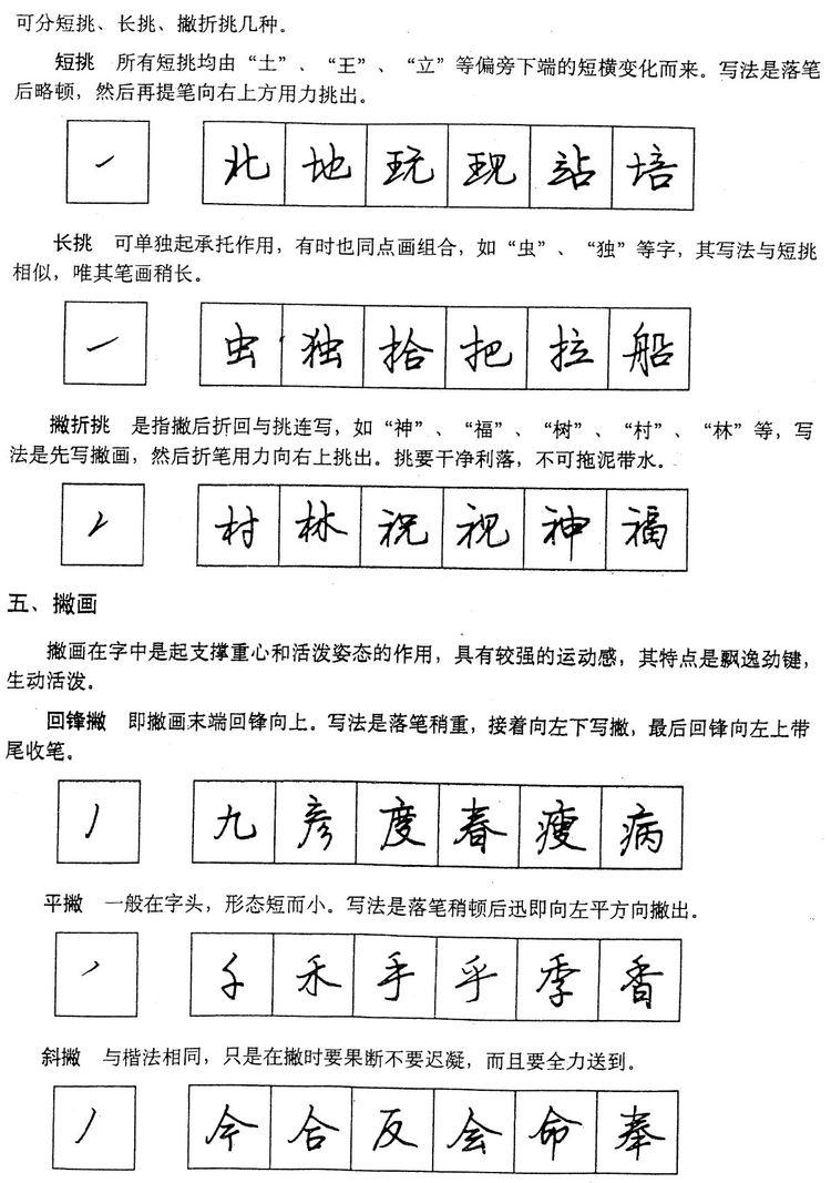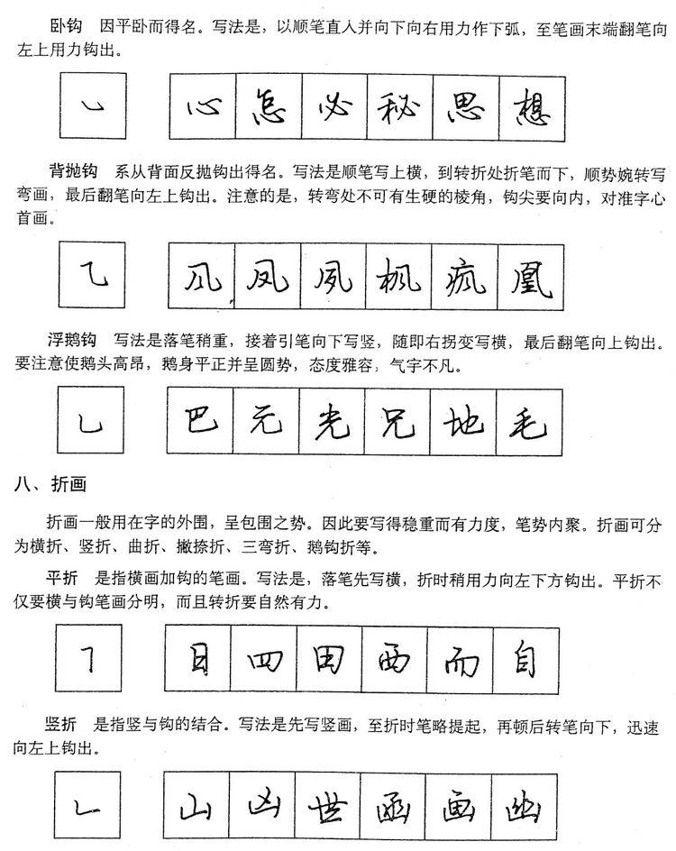 翻笔,一般是向上取逆势,上一笔接下一笔出现的钩挑,如“古”字的横,“人”、“有”的撇,都是用翻笔写成的。折笔,一般是向下、向右取顺势,如“口”字的横折、“山”字的竖折,都是用折笔写成的。不论翻笔、折笔,都要求用笔慢而用力。