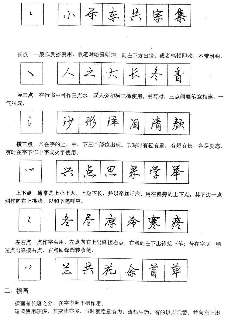 行书的基本笔画比楷书变化大,它运笔的轻重、快慢,都表现出明显的节奏感,起伏跳跃,书写时要根据运笔要领,注意提按,尽力表现笔画的神态。
