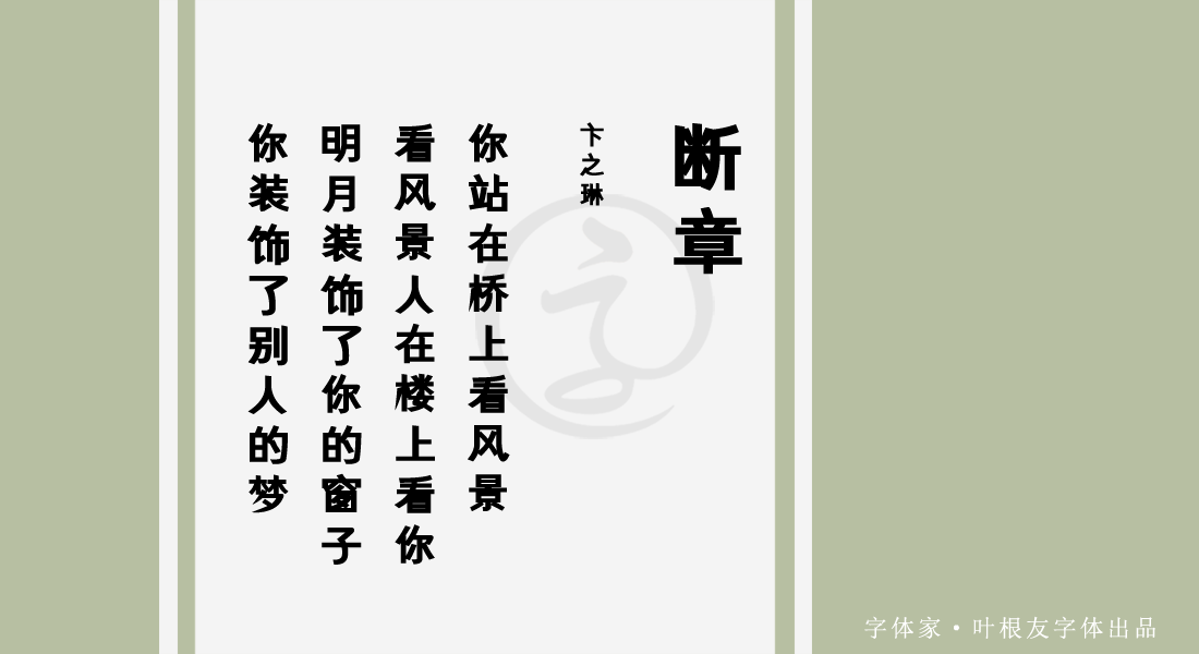 相信书法家叶根友的很多款字体不少朋友都不陌生,因为近几年来,大街小巷、产品包装等场景,很多设计师都非常喜欢使用的他的字体。他的每一款字体都结合了美的理念,有的具有复古情怀,有的具有现代感,有的又具有强烈的表现张力。今天给大家说一下叶根友微宋特黑字体,这是一款粗犷超黑风格的字体,也是是微黑系列中比较实用的一款,该字体笔画铿锵有力,整体效果十分醒目。