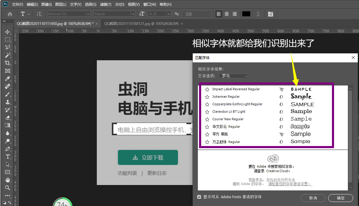 第四步:这时PHOTOSHOP软件就会自动搜索匹配字体,并搜索到的字体展示出来,我们可以选择最相近的字体进行匹配,选择对应的字体并点击“”确定“”按钮就可以了。