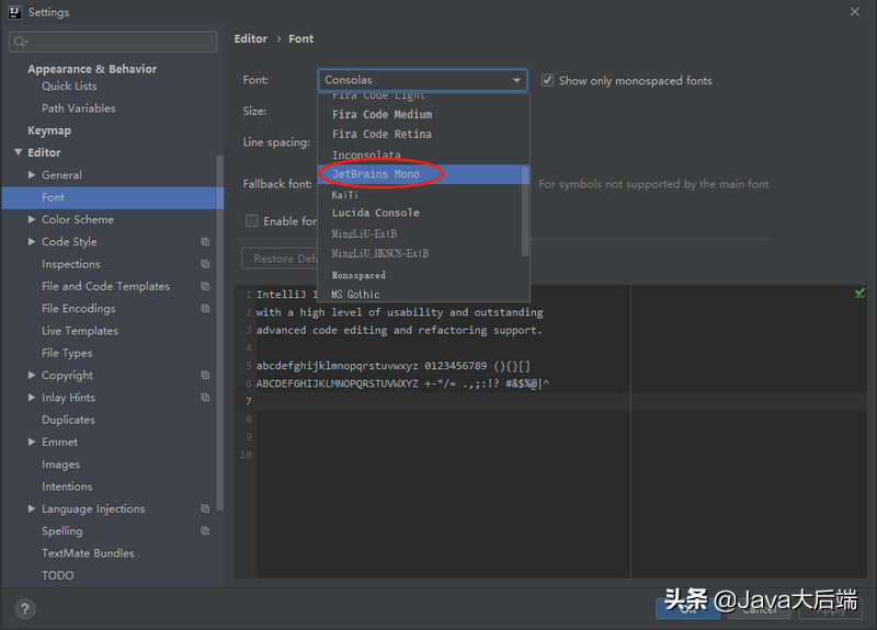 Preferences/Settings → Editor → Font, 然后选择 JetBrains Mono 字体。