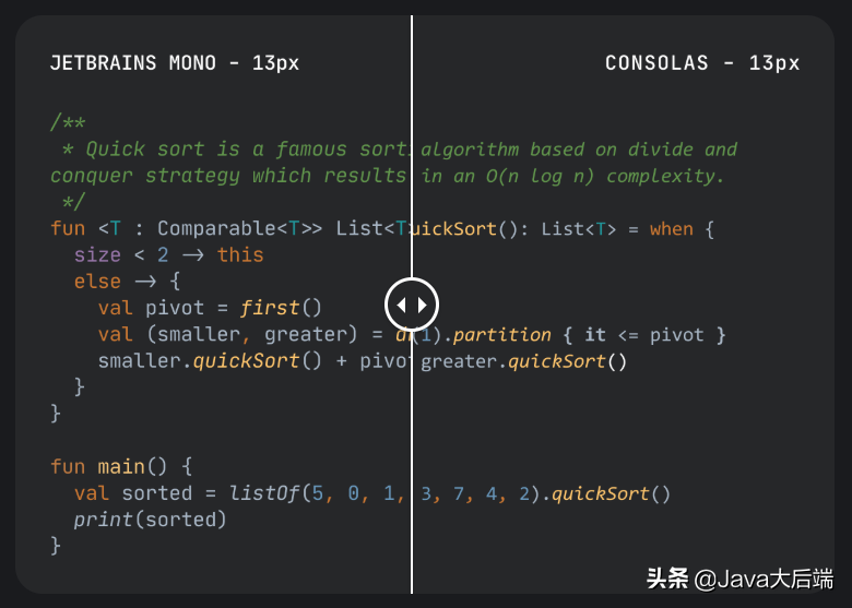 如果你说,没什么舒适不舒适的,差不多,你再来看下 JetBrains Mono 和 Consolas 这两种字体的比较,应该明清晰了: