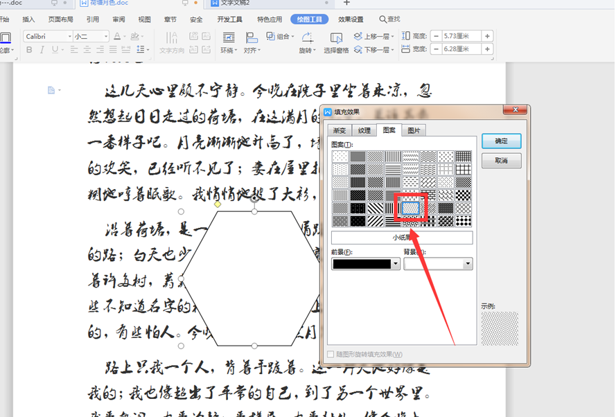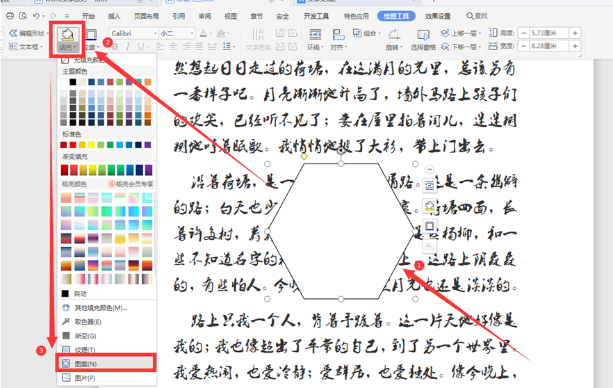 我们在合适的位置画出六边形,在弹出的菜单栏中选择【填充】,下一级菜单中选择【图案】:
