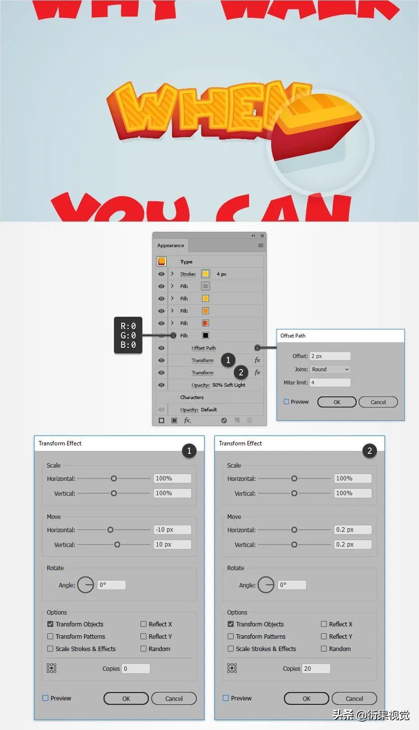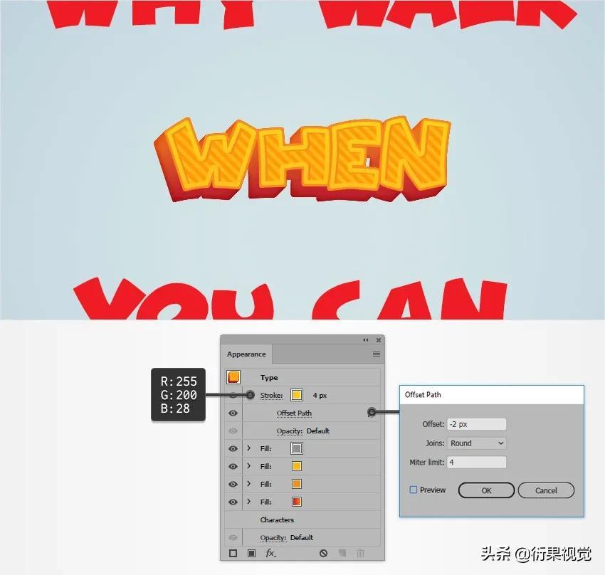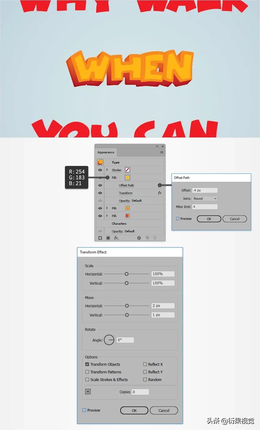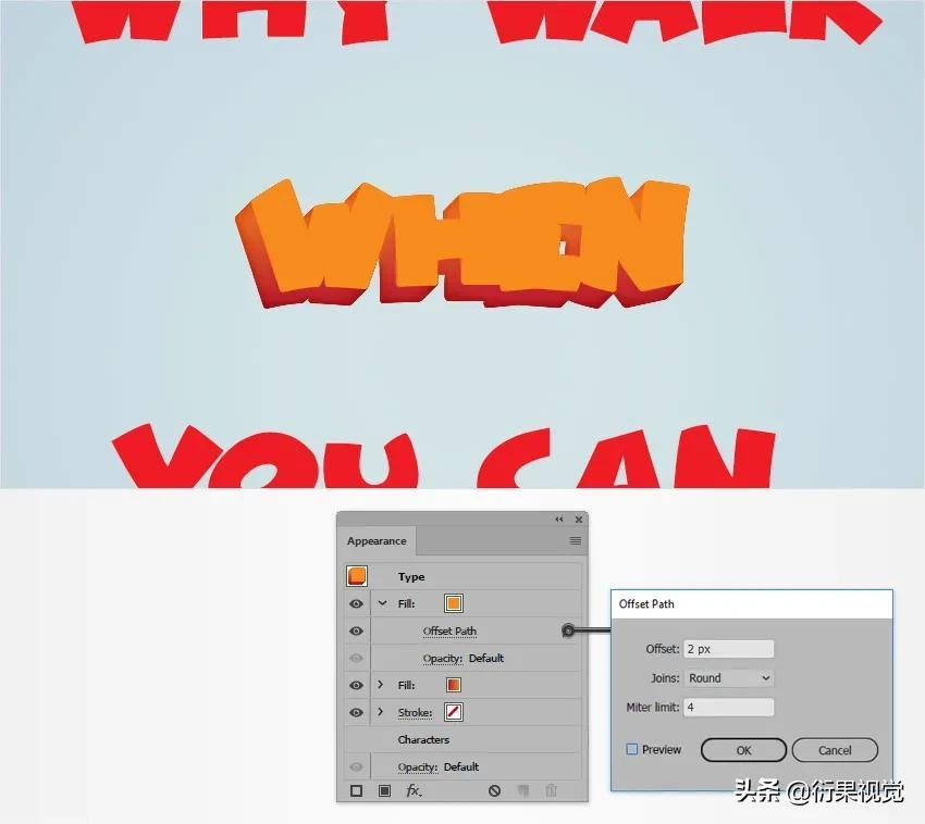 确保仍选择橙色文本,并继续关注外观面板。选择该顶部填充,然后转到“ 效果”>“路径”>“偏移路径”。输入2 px的偏移量 如图设置