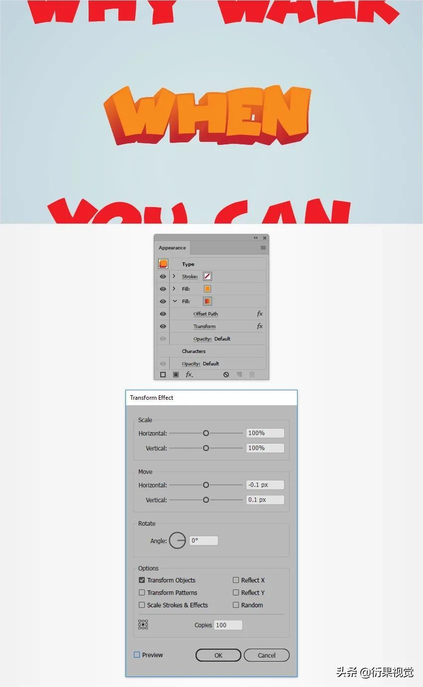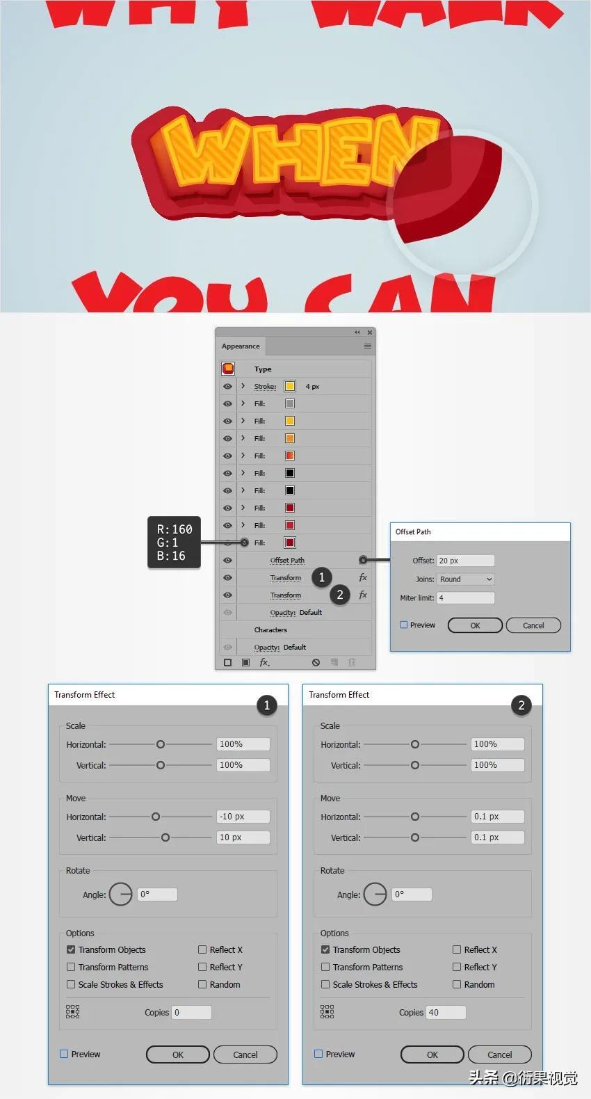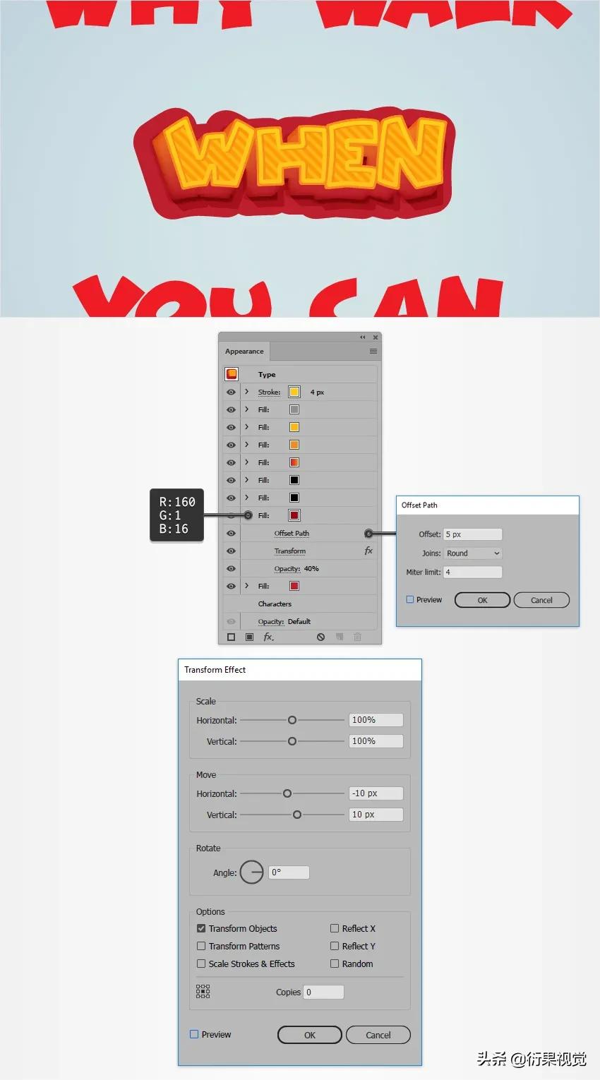 确保仍选择橙色文本,并继续关注外观面板。选择该顶部填充,然后转到“ 效果”>“路径”>“偏移路径”。输入2 px的偏移量 如图设置