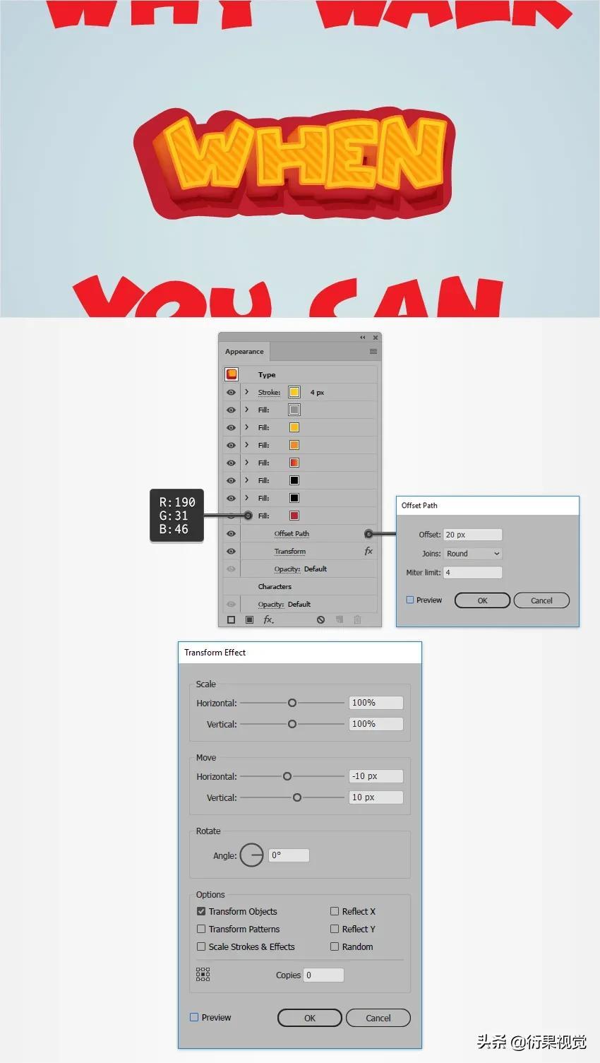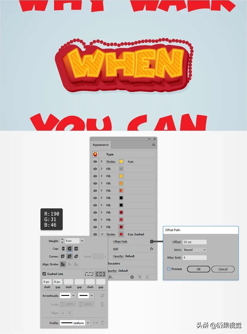 选择此新笔触,将其颜色设置为R = 190 G = 31 B = 46,然后转到“ 效果”>“路径”>“偏移路径”。输入20 px的偏移量 如图设置