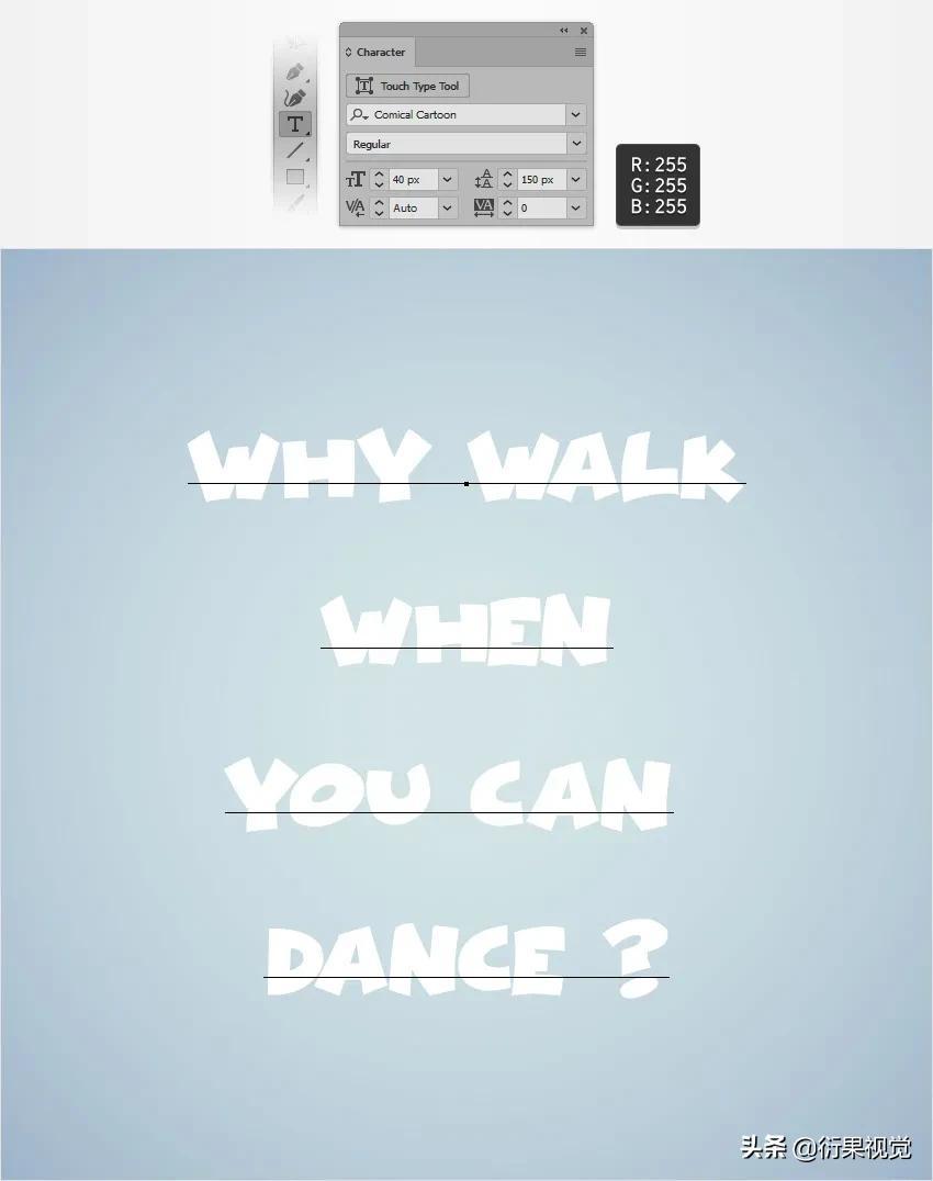 选择“ 文字工具”(T),然后打开“ 字符”面板(“ 窗口”>“文字”>“字符”)。选择Comical Cartoon字体,然后将大小设置为40 px,将行距设置为150 px。只需单击您的画板上,添加文本列,然后将其设置为白色。